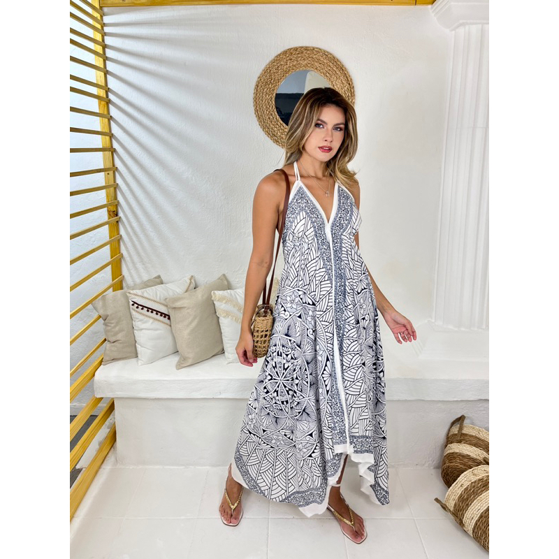 VESTIDO LONGO LEN O PONTAS MANDALA PRETO BOLSAS BOHO