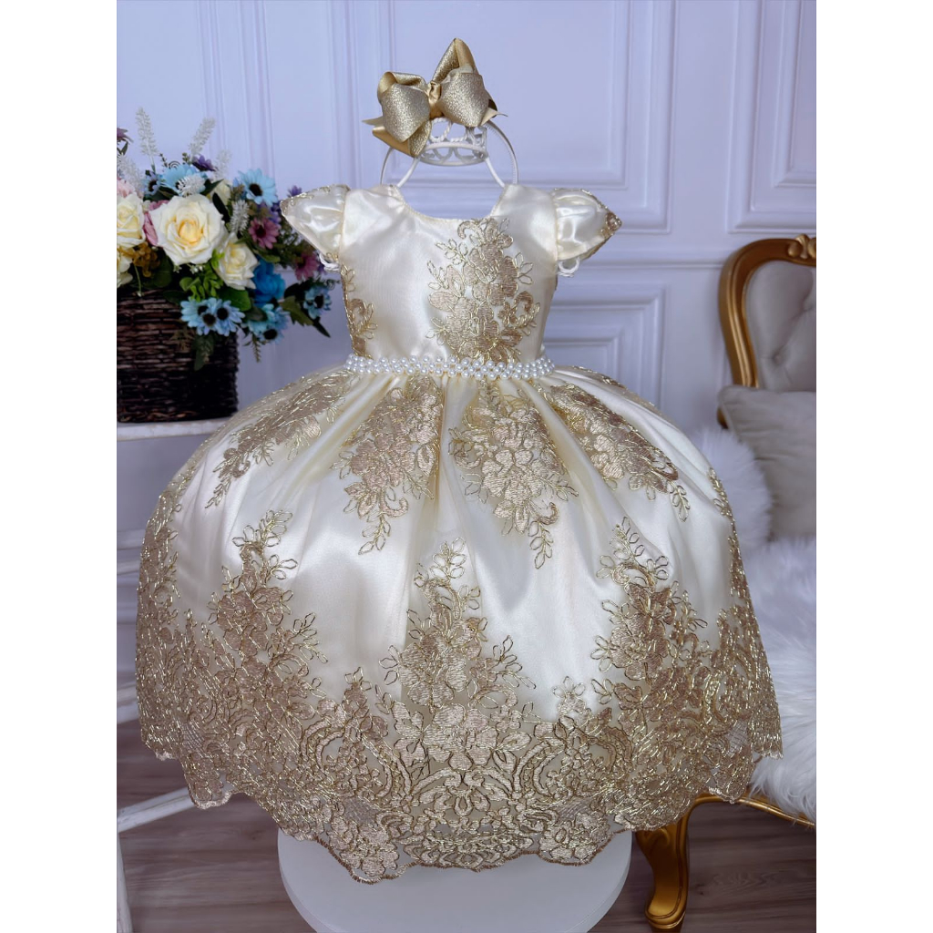 Vestido Infantil Bege Com Dourado Luxuoso Midi Perfeito Para