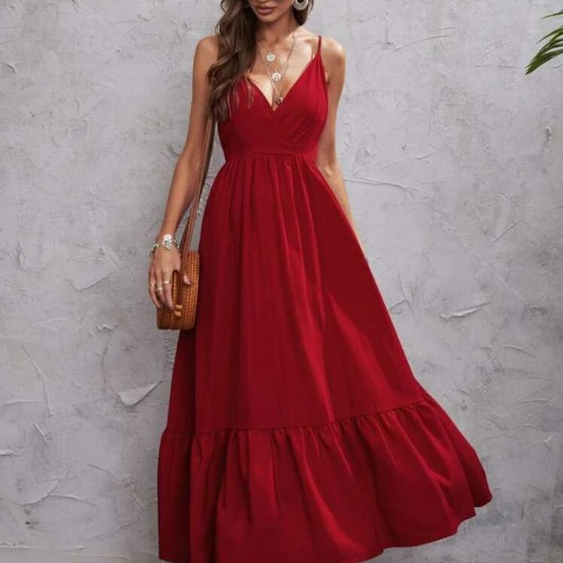 Lindo Bainha de Ruffle Simples Boho Vestido Vermelho Shein