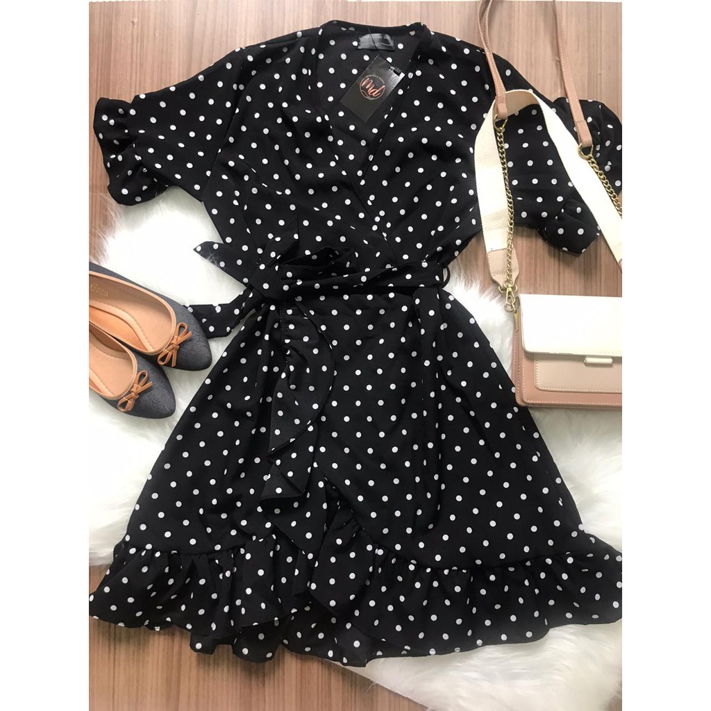 Vestido envelope curto po tipo envelope bolinhas preto e branco