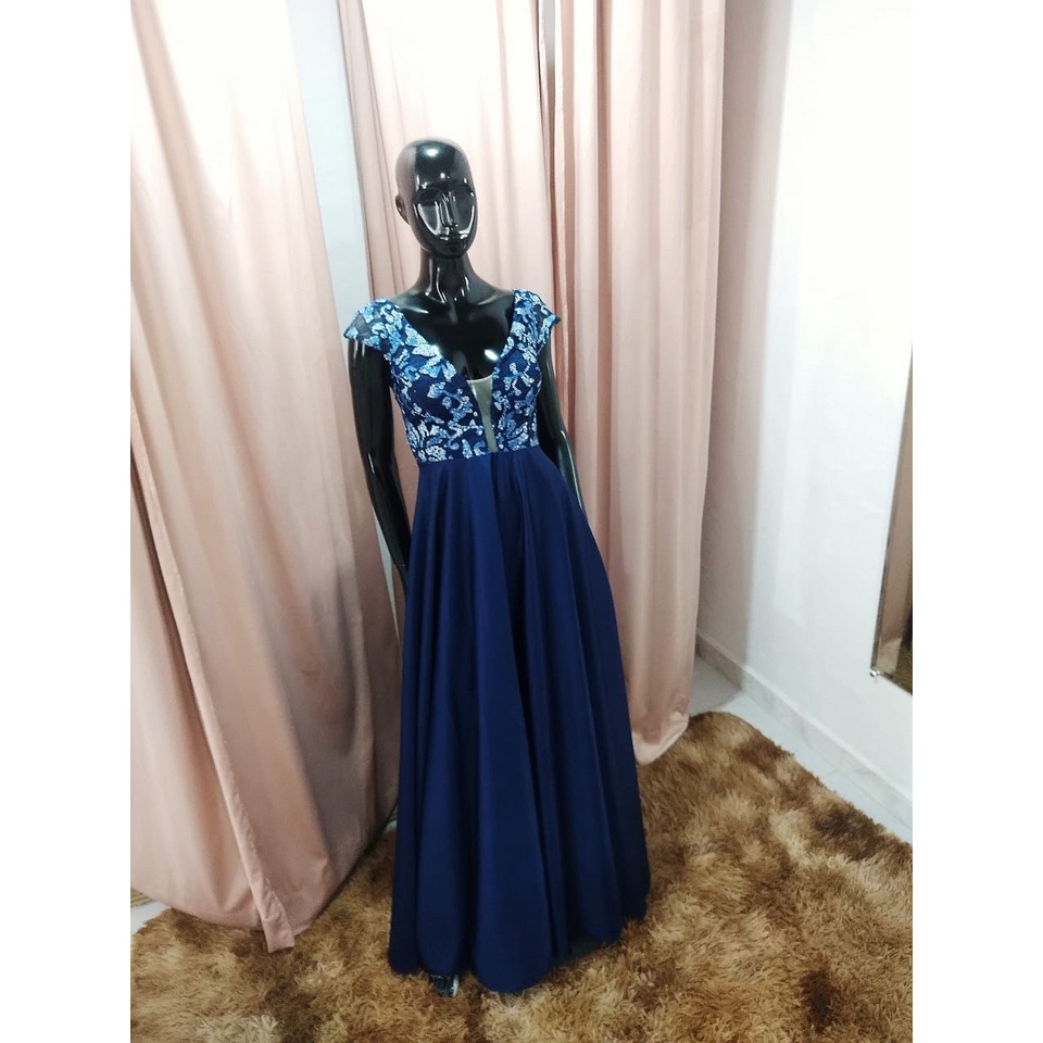 Vestido de Festa Longo Azul Marinho em Renda Impression Modas