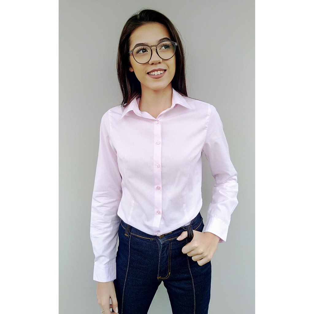 Camisa Social Feminina Manga Longa Tricoline Linda Urbana Cor Rosa Claro