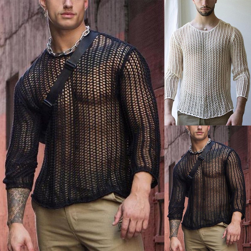 Camisa Masculina De Malha Com Manga Comprida Transparente Para