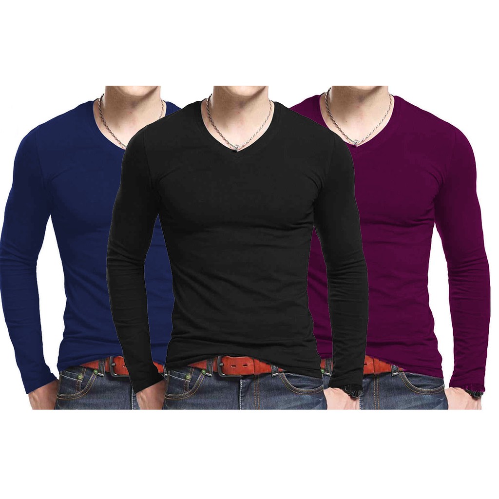Camisa de malha clearance manga longa masculina, Kit 3 Camisetas Masculinas Gola V Slim Fit Manga Longa Com Lycra clearance