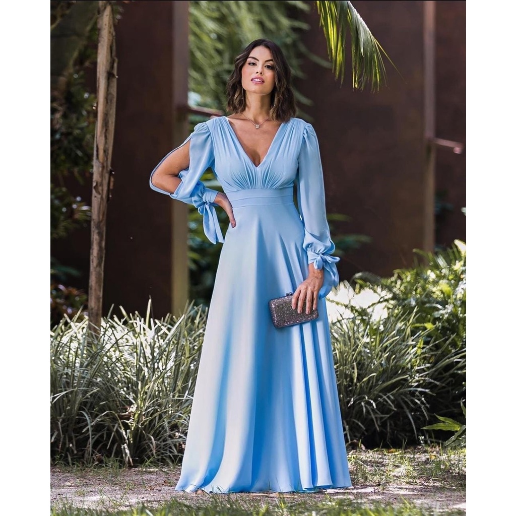 Vestido longo todo em musseline Cor Serenity manga longa com recorte lateral e la o no punho possui forro bojo e z per lateral