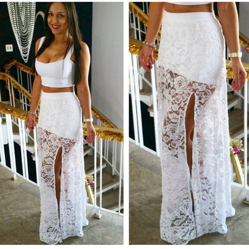 Saia Longa De Renda Cintura Alta Aberta Perna Fenda Lateral