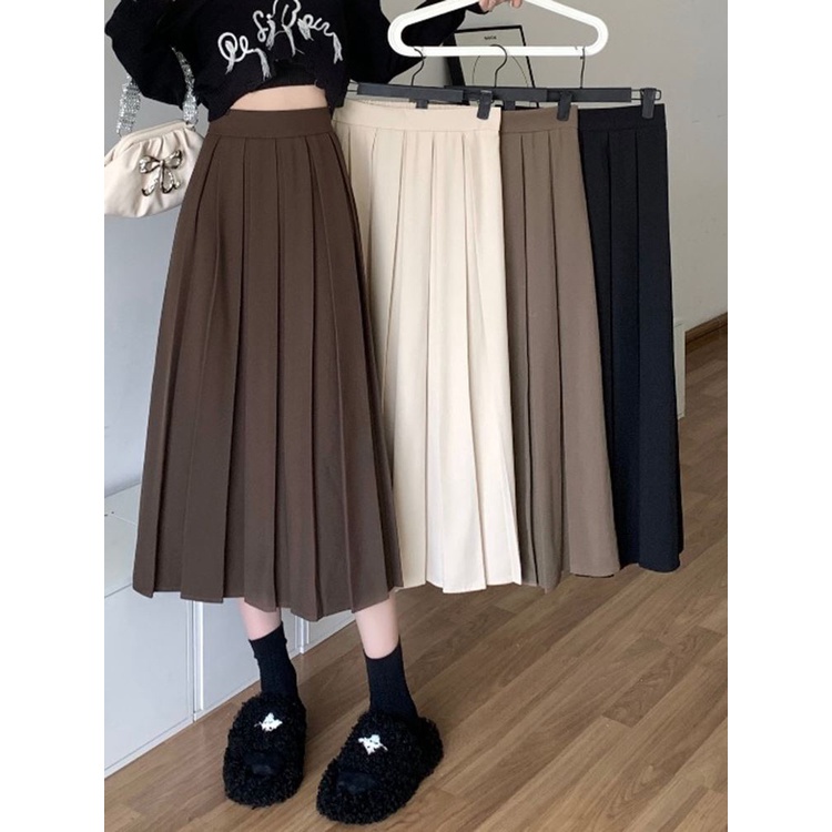 Saia clearance meia longa, Saia de busto de cintura alta meio longa plissada saia de linha clearance