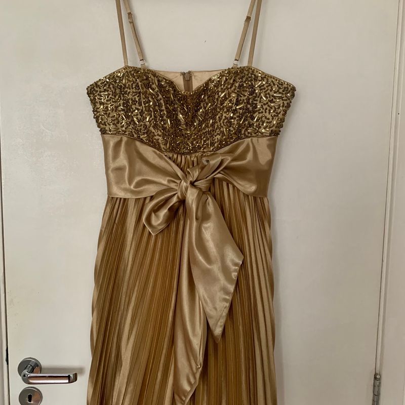 Vestido Plissado Curto de Festa Dourado Roupa de Casamento