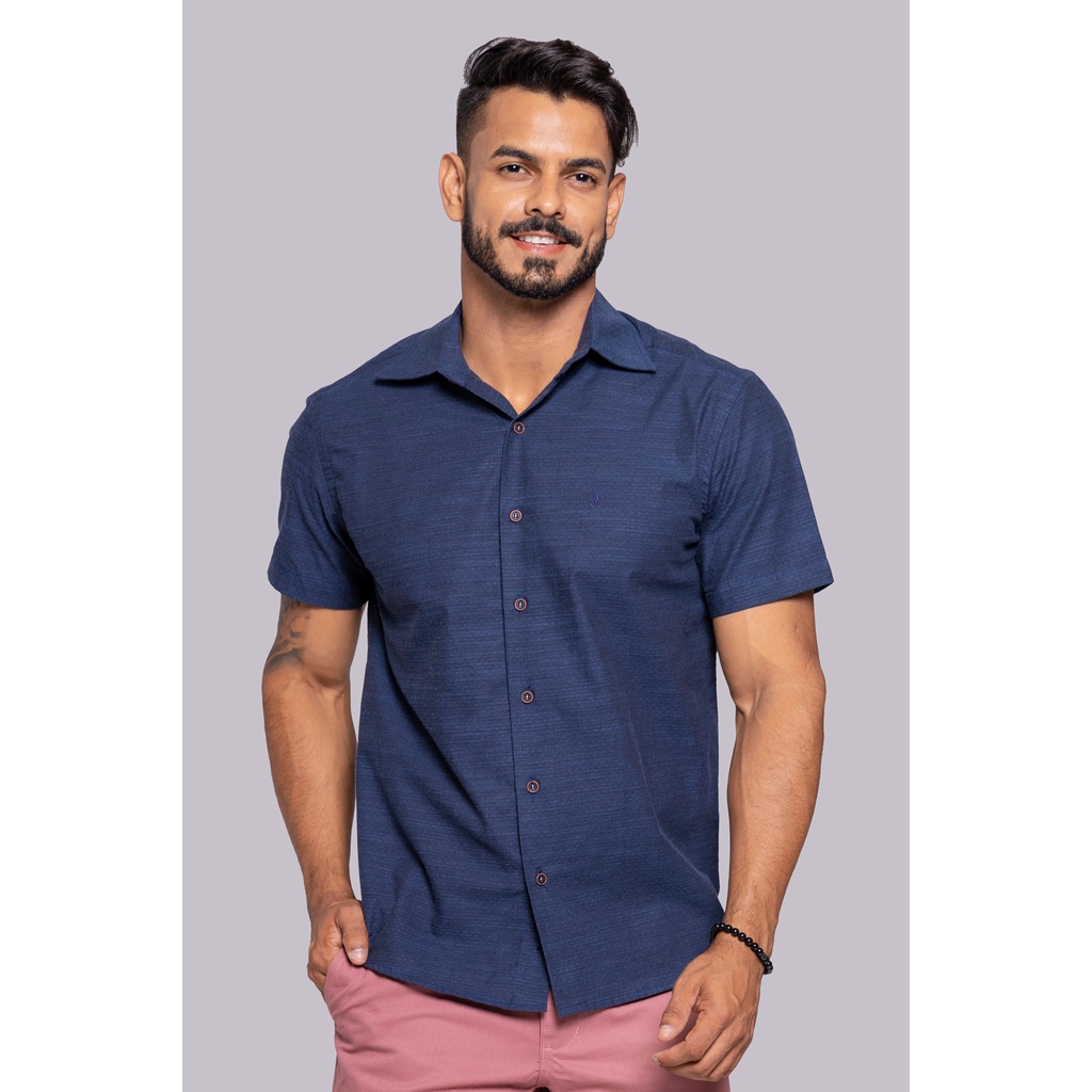 Camisa Social Azul Marinho Jeans Manga Curta 100 Algod o Hilios