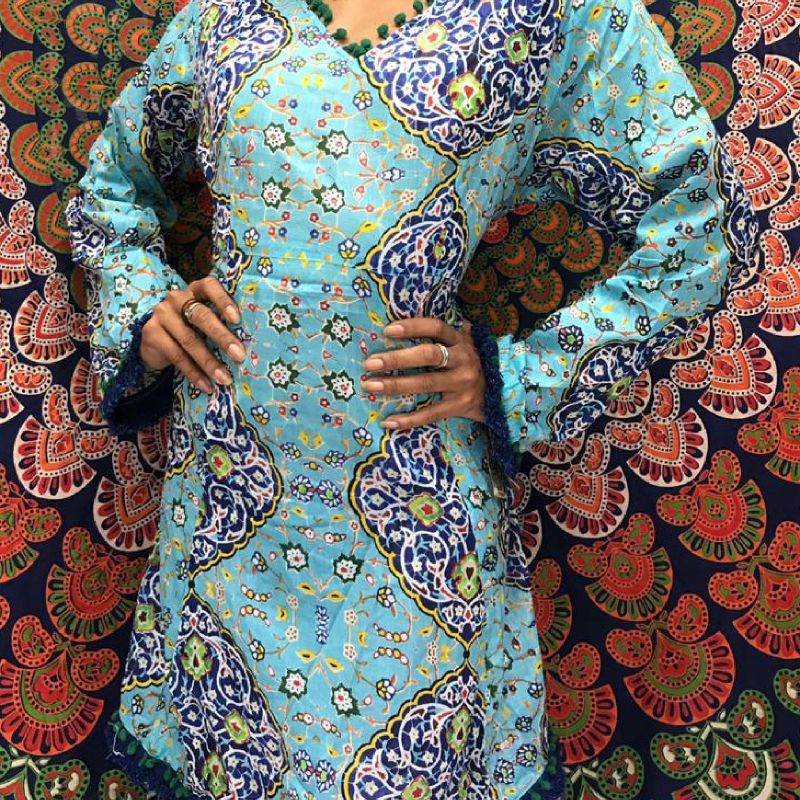 Vestido Indiano Curto com Manga Longa e Detalhes Prata