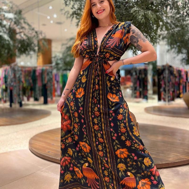 Vestido Longo Longuete floral com Lastex no Busto manga princesa modelo camponesa estilo farm