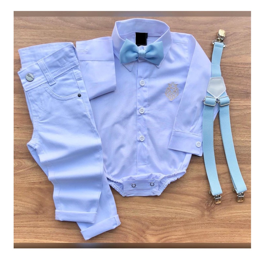 Roupa Batizado Menino Bermuda Branca Suspens rio Camisa Social e