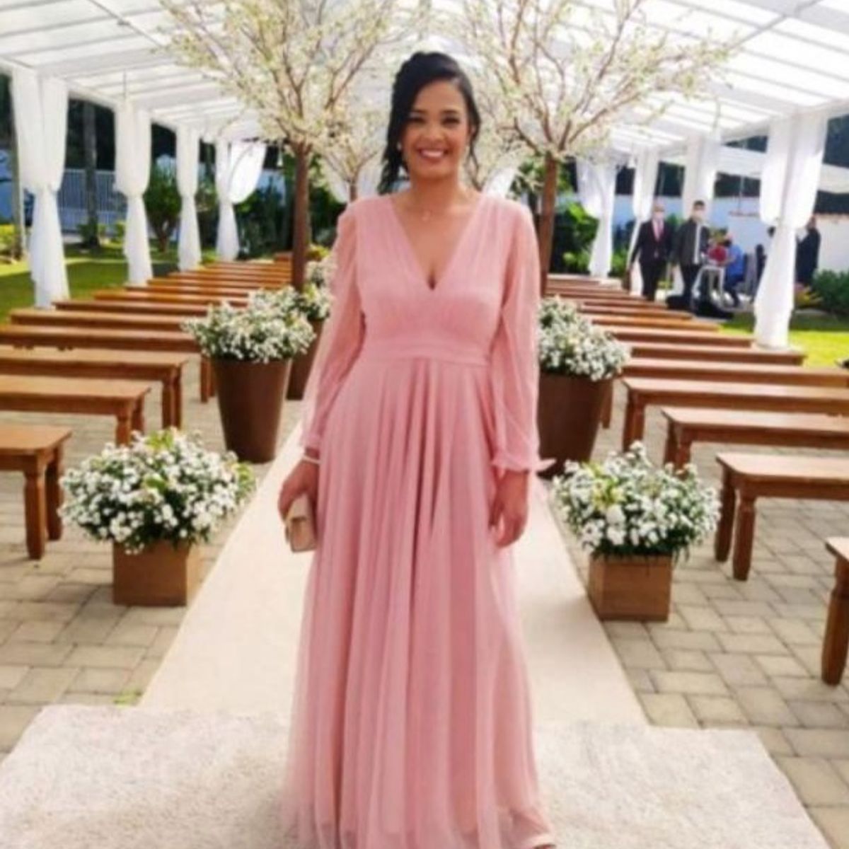 Vestido Rose Para Madrinha Com Manga Longa Solta