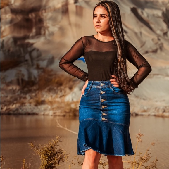 Saia Jeans Longa Clara Babados Moda Evang lica Feminina Rebeca