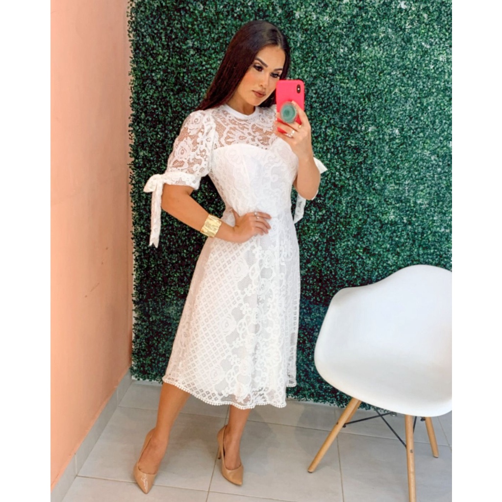 Larissa Vestido Noiva Midi Rodado Manga Curta com La o em Renda Formatura Casamento cor Branco Off M87