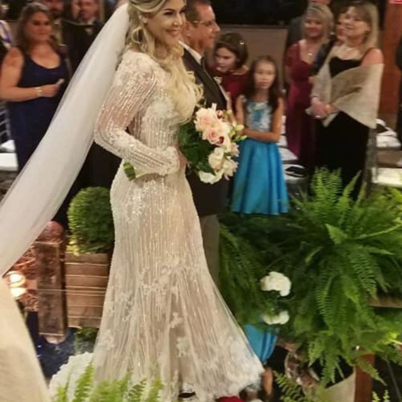 Lexa usa vestido bordado com cristais Swarovski em casamento
