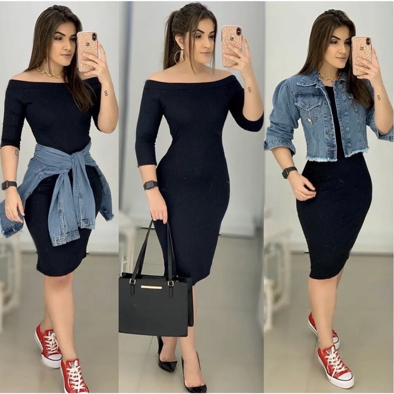 Vestido Feminino Midi Canelado Ombro a Ombro Manga Longa Shopee