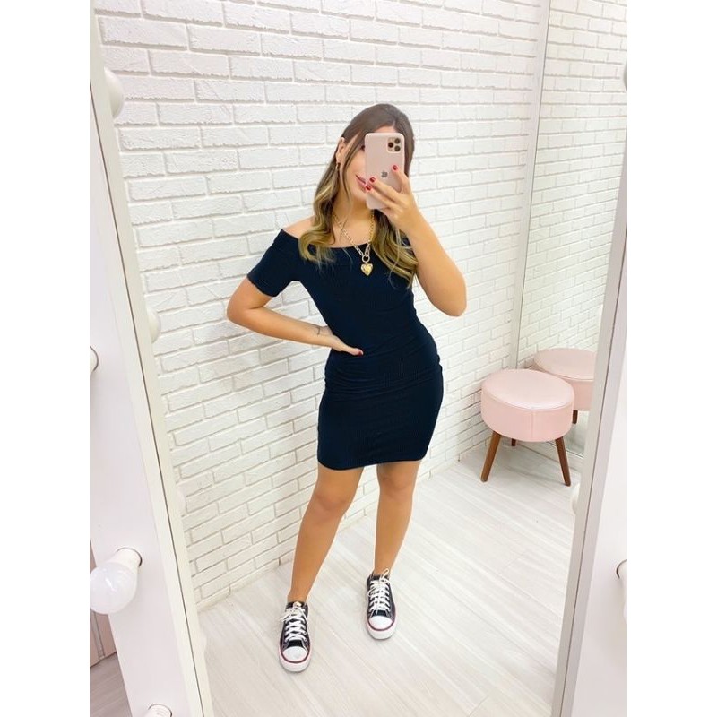 Vestido Canelado preto ombro a ombro feminino bojo