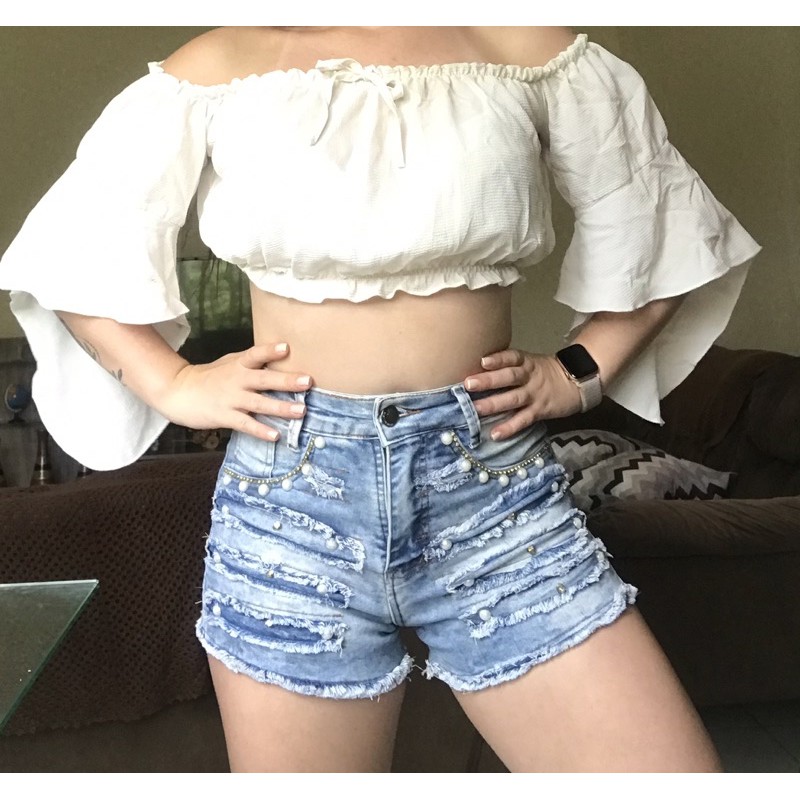 Conjunto Cropped ciganinha nude short jeans cintura alta brech desapego