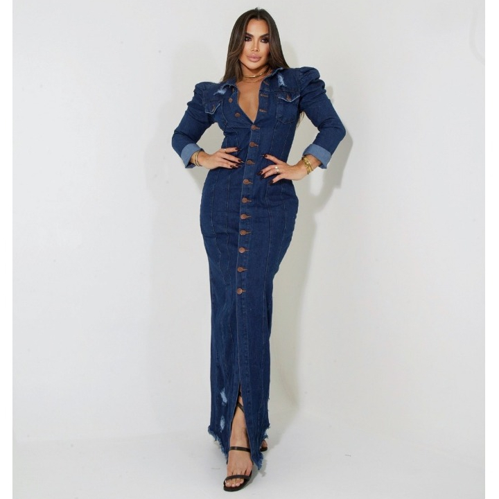 Vestido jeans longo clearance manga comprida, Vestido longo jeans longo com manga comprida 100 algod o clearance