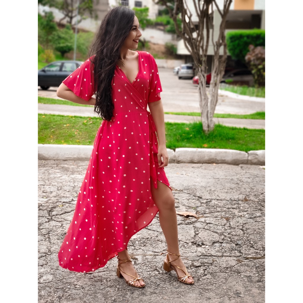 Vestido Envelope Manga Curta Feminino Poa Vermelho
