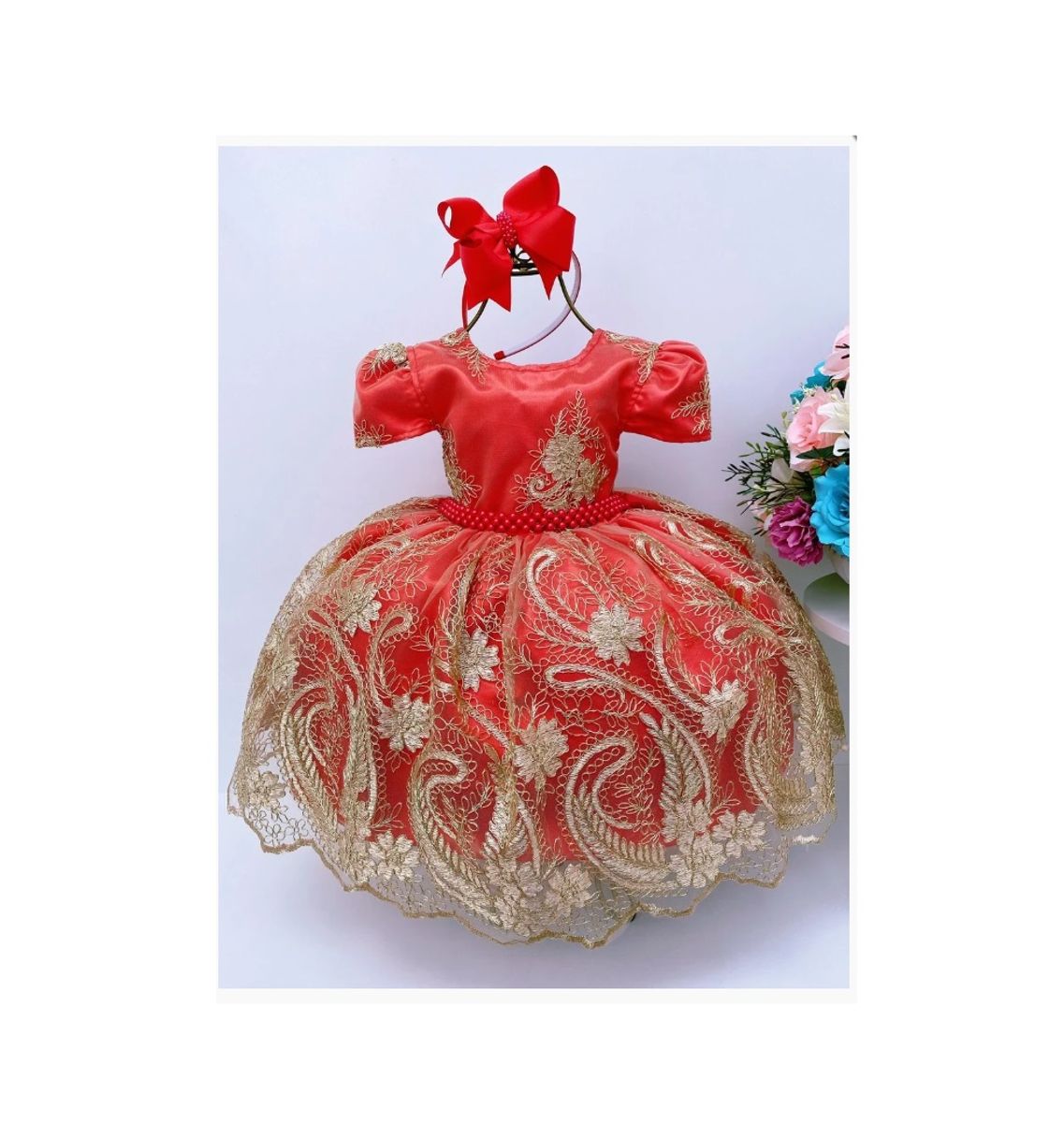 Vestido vermelho com clearance renda dourada, Vestido Vermelho Renda Realeza Dourada Roupa Infantil para clearance