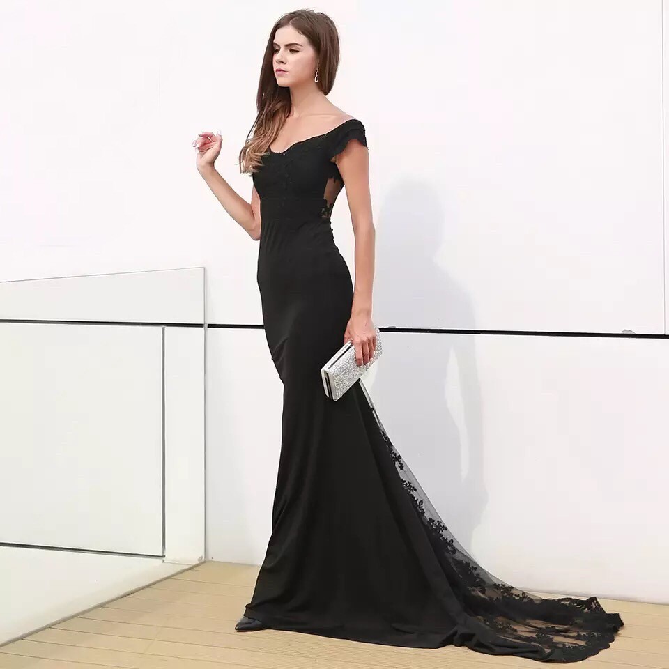 Vestido de festa preto com calda bordada