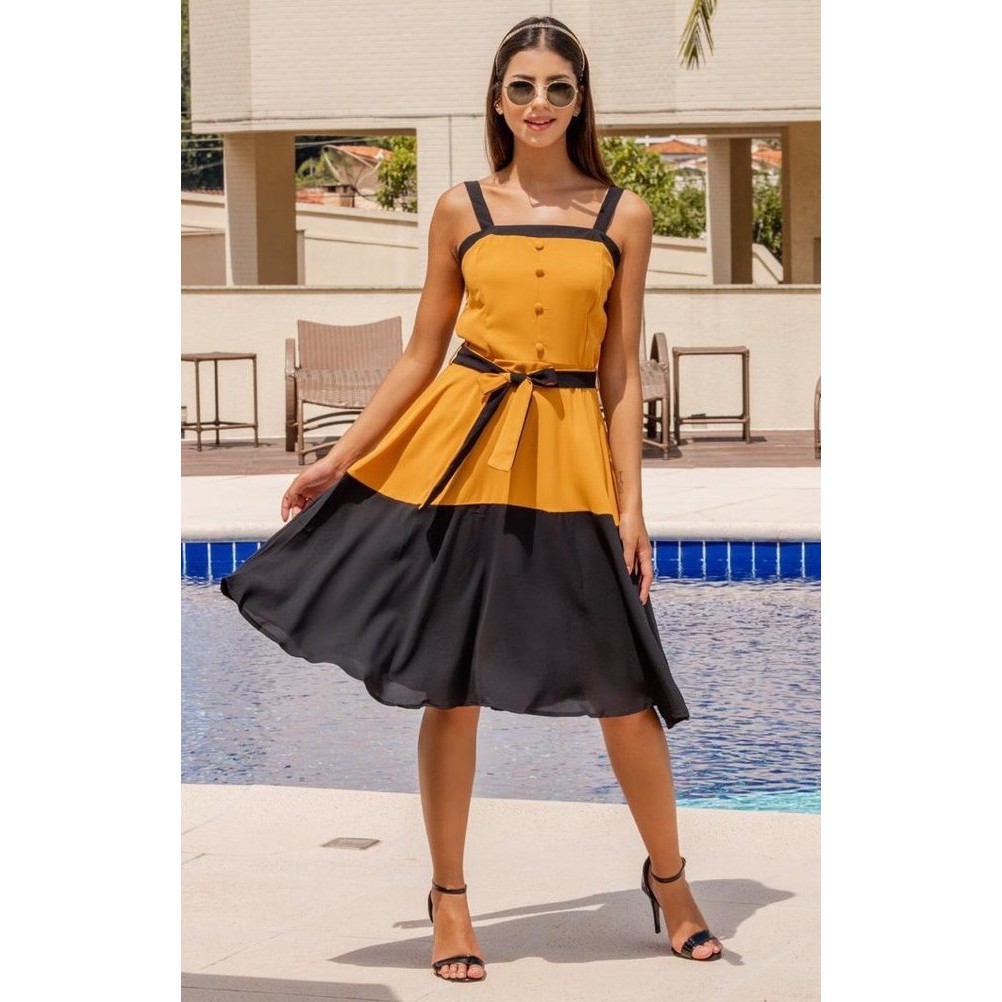 Vestido mostarda com clearance preto, Vestido Nereida Mostarda Gira as clearance