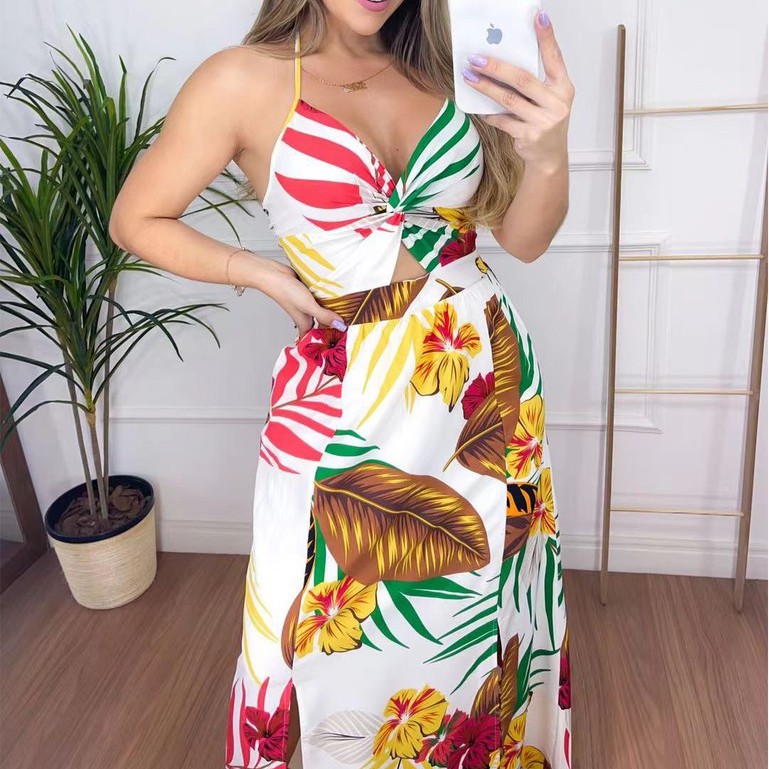 Vestido longo feminino envelope sensual aberto nas pernas alcinha fenda decotado Estampada Florais Y0003