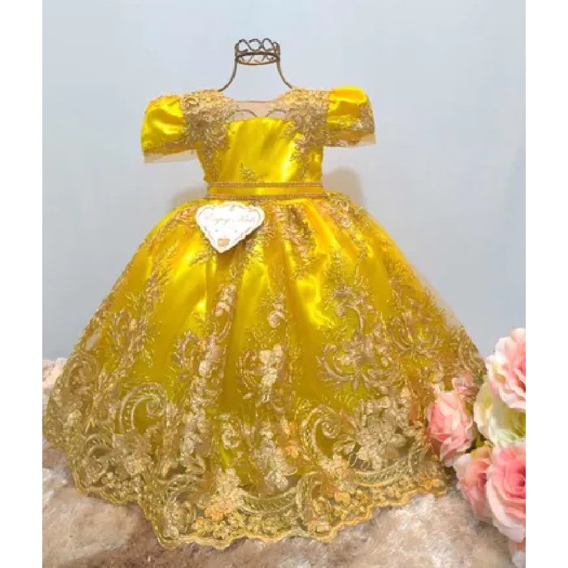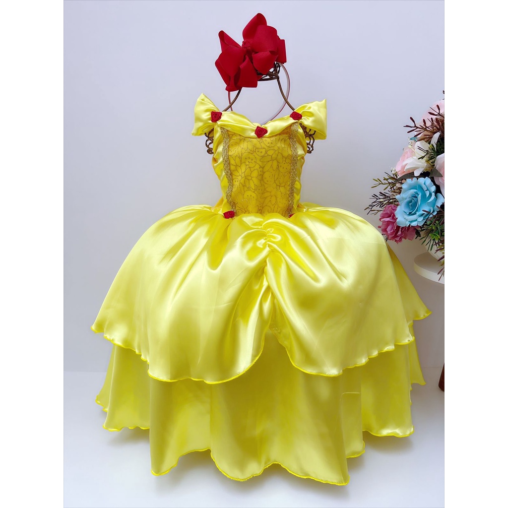 Vestido Princesa Bela E A Fera Luxo Infantil Festa Amarelo Tamanho 01 A 03
