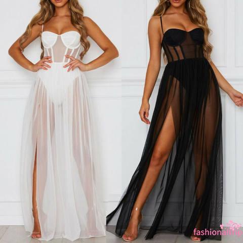 Vestido de festa com transpar ncia nas pernas 50 longos Pronta