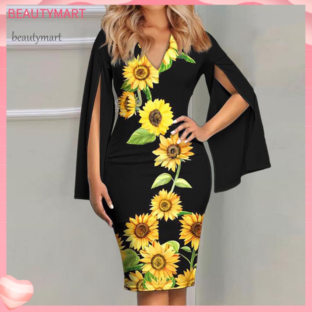 Vestido Con Estampado De Girasol Vestido Casual De Manga 3 4 Con Cuello En V Ropa De Mujer