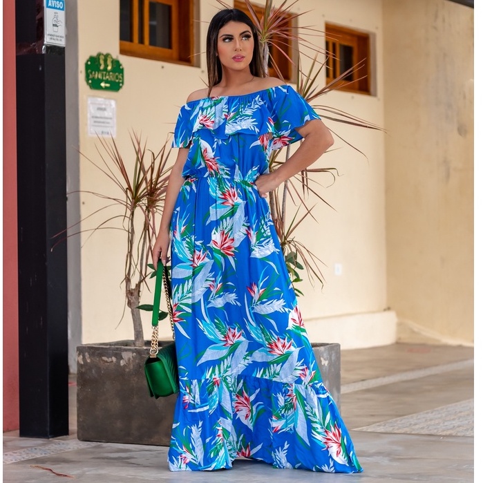 Vestido Estampado Ombro a Ombro com Babados e Amarra o na Cintura