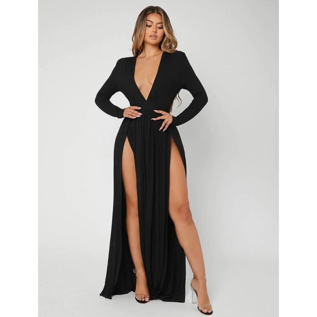 Vestido longo com clearance fenda manga longa, Vestido longo sexy gringo com fenda na lateral manga longa clearance
