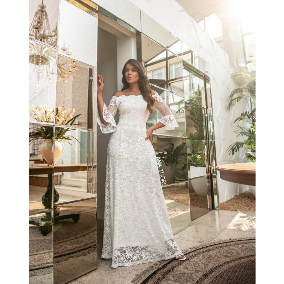 Vestido de noiva com clearance manga ombro a ombro, Karen Vestido Festa Longo Manga 3 4 Ombro a Ombro com Guipure clearance