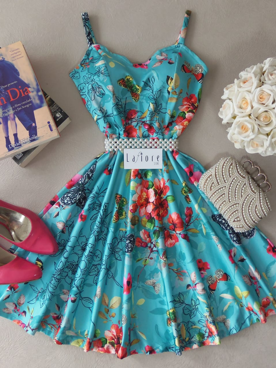 Vestido Rodado de Al as Finas Azul Turquesa com Borboletas