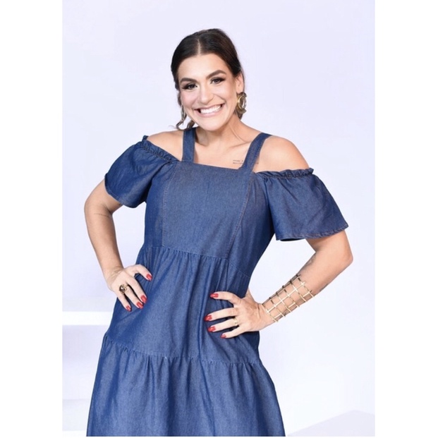 Vestido ombro a ombro com al a e manga ciganinha Divina Vit ria
