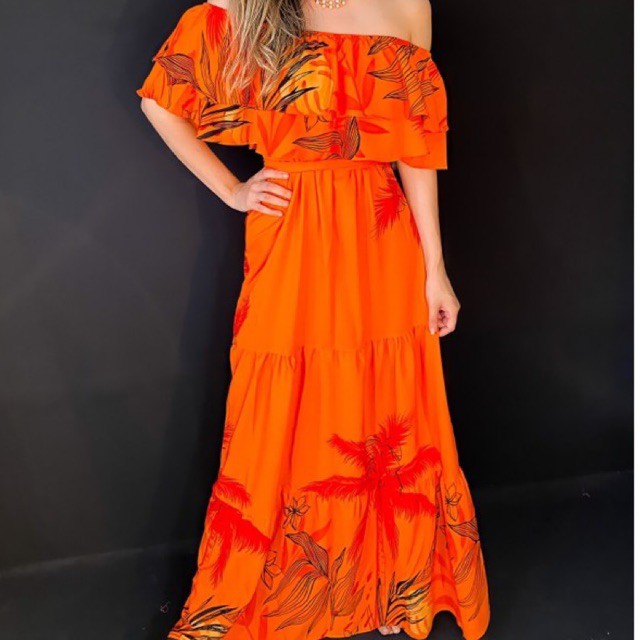 Vestido longo Laranja Florido ombro a ombro