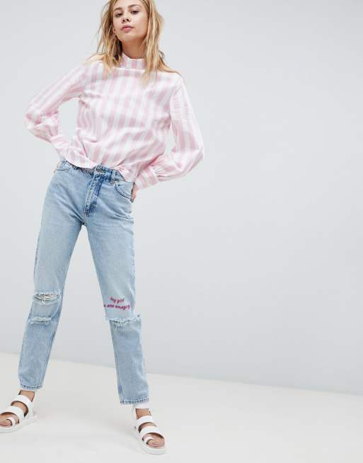 Monki Kimono Jeans met gescheurde knie n en tekst