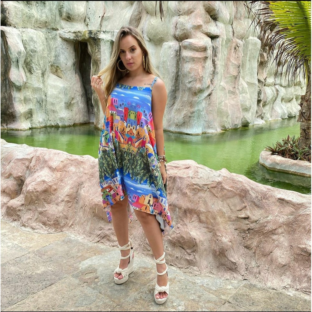 Vestido good vibes preto lunar vestido al a estampa praiana ponta alongada