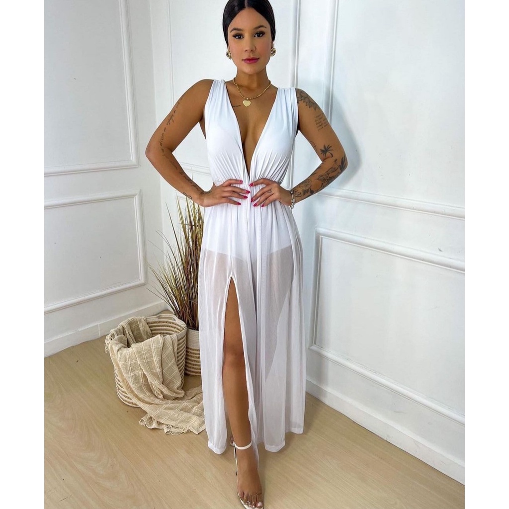 Vestido Body Shorts de Tule Longo com Fenda Decotado Transparente Transpar ncia Regata Decote Luxo Festa Reveillon Ano Novo