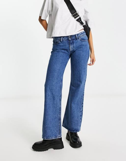 W ven Jeans met lage taille en wijde pijpen in indigo met wassing