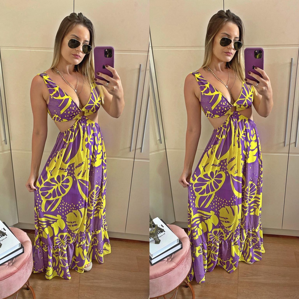 Vestido Longo Estampado Fluity Abertura Lateral Sandy Cia do