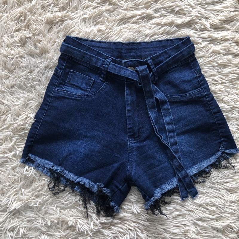 short jeans bermuda azul escuro com cinto de amarrar barra desfiada
