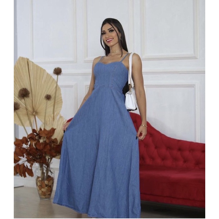 vestido longo jeans de alcinha P M G GG Shopee Brasil
