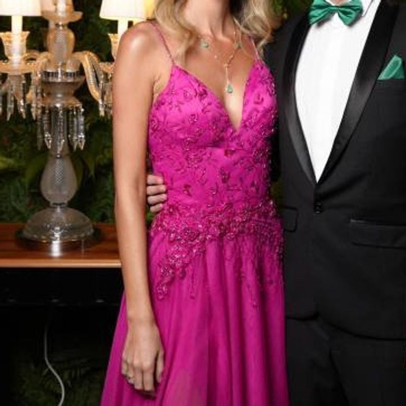 Vestido de Festa Rosa F csia de Tule Bordado e Pedraria com Fenda