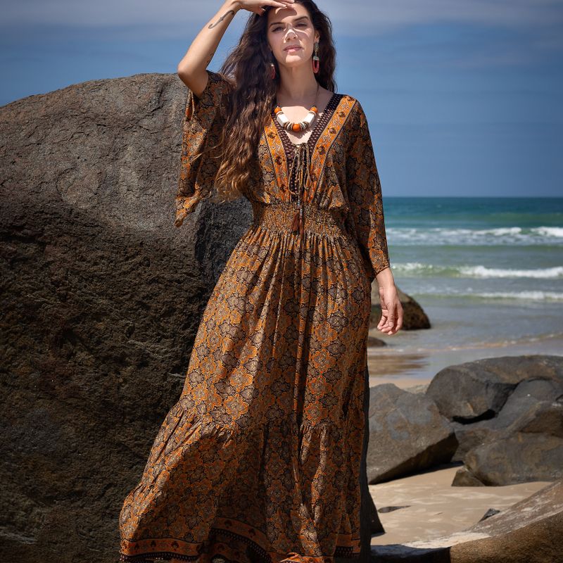 Vestido Longo Estampado Boho de Manga Curta Acinturado
