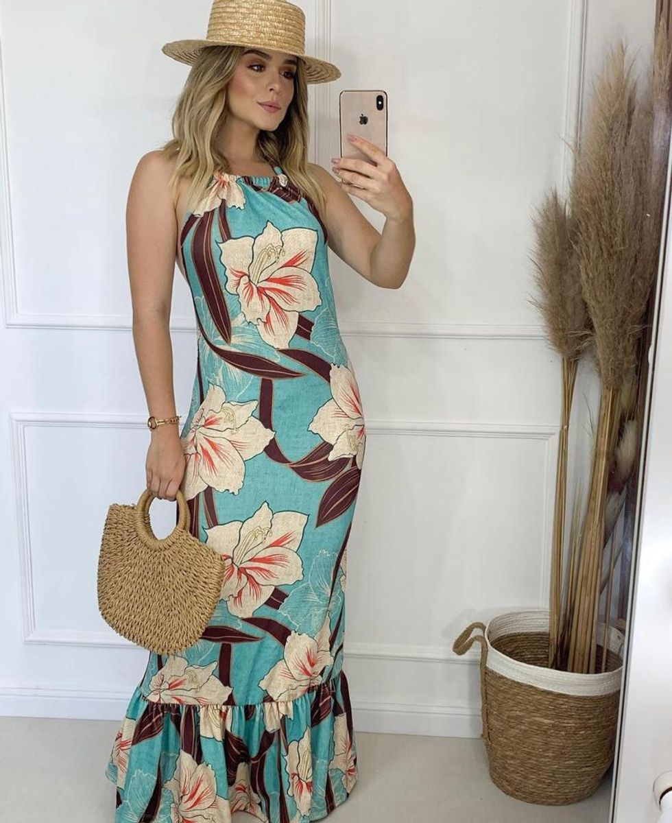 Vestido longo com clearance babado na frente, Vestido Longo De Alcinha Forrado Modelo Bot o E Babado Poa clearance