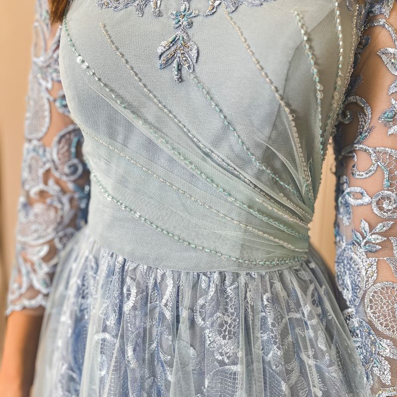 Vestido de Festa Azul Acinzentado Longo Bordado Fab ola Amorim