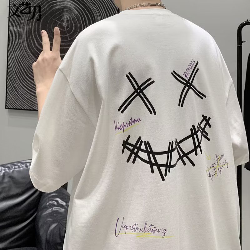 Roupas clearance masculinas pretas, Ver o Coreano XX Smiley Design Camisas Casuais Impressas Camisetas Pretas Brancas Manga Curta Masculina Estilo Rua Mais Tamanho Unissex Roupas clearance